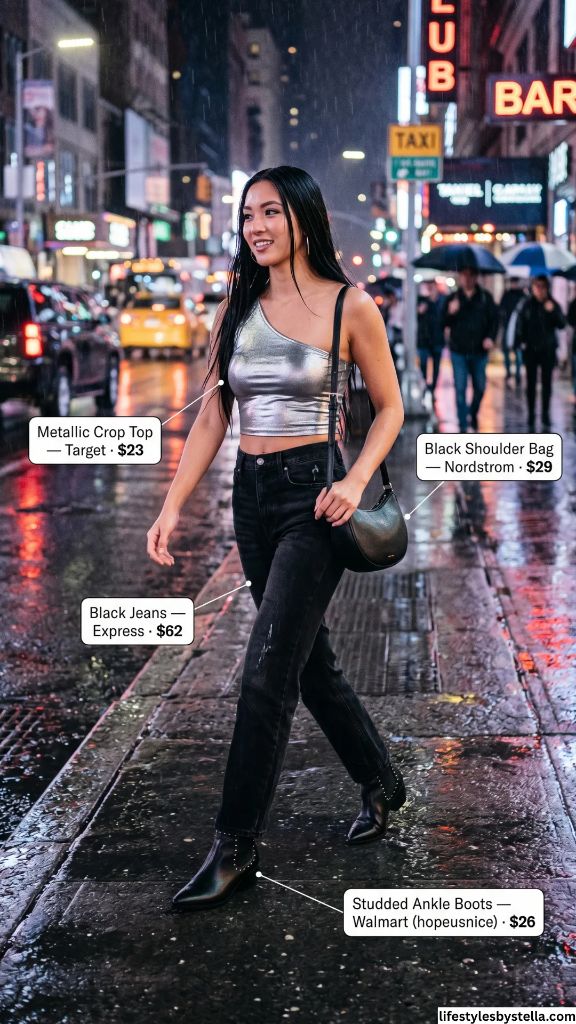 There’s something electric about metallic against black denim at night. This silver one-shoulder crop top paired with black straight-leg jeans and studded ankle boots is the kind of outfit that owns the room — or in this case, the rain-slicked city street. The asymmetric neckline adds drama, the metallic fabric catches every light source like a mirror, and the black denim keeps everything anchored and cool. It’s a straight leg jean outfit for the woman who doesn’t shy away from attention.