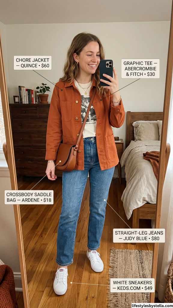 Shop This Look: The Chore Jacket is from Quince at $60 — shop it here. The Graphic Tee from Abercrombie & Fitch at $30 — find it here. The Straight-Leg Jeans by Judy Blue for $80 — grab them here. The Crossbody Saddle Bag from Ardene at $18 — check it out here. And the White Sneakers from Keds at $49 — shop them here.