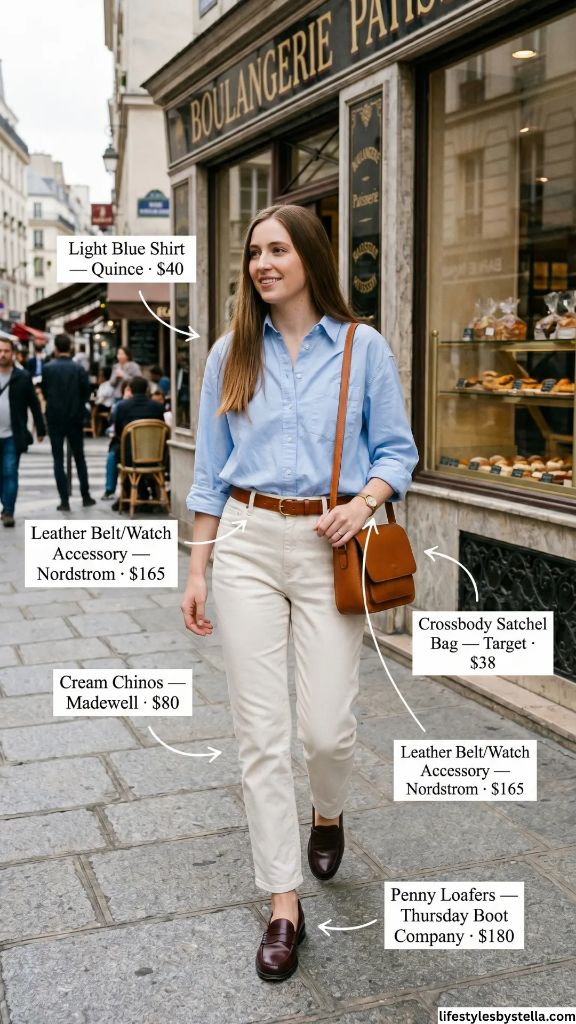 This is the kind of outfit I’d wear if I were wandering through a European city in July — and honestly, it works just as well picking up groceries in your neighborhood. The color palette is soft and intentional: powder blue, warm cream, rich leather tones. Everything complements without competing. If you’re planning a trip and need European summer outfit inspiration, this look translates directly. Swap the chinos for white or ecru straight-leg jeans, keep the loafers, keep the leather accessories — done.