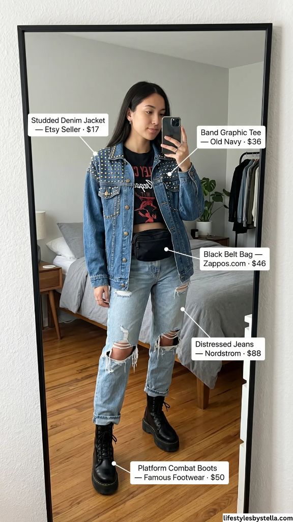 Shop This Look: The Studded Denim Jacket is from an Etsy Seller at $17 — shop it here. The Band Graphic Tee from Old Navy at $36 — find it here. The Black Belt Bag from Zappos at $46 — grab it here. The Distressed Jeans from Nordstrom at $88 — check them out here. And the Platform Combat Boots from Famous Footwear at $50 — shop them here.