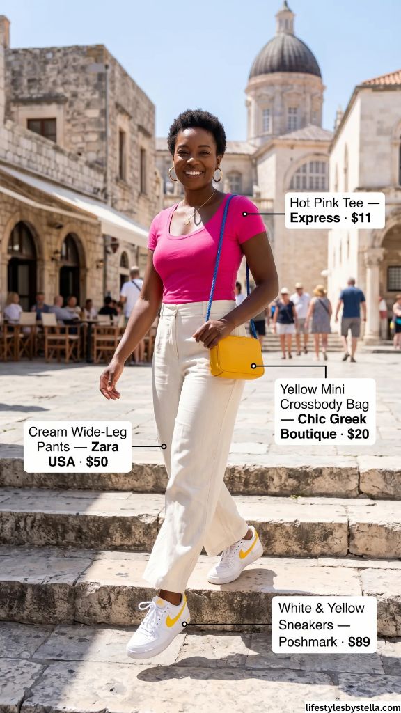Shop This Look: The Hot Pink Tee is from Express at $11 — shop it here. The Cream Wide-Leg Pants from Zara USA at $50 — find them here. The Yellow Mini Crossbody Bag from Chic Greek Boutique at $20 — grab it here. And the White & Yellow Sneakers from Poshmark at $89 — check them out here.