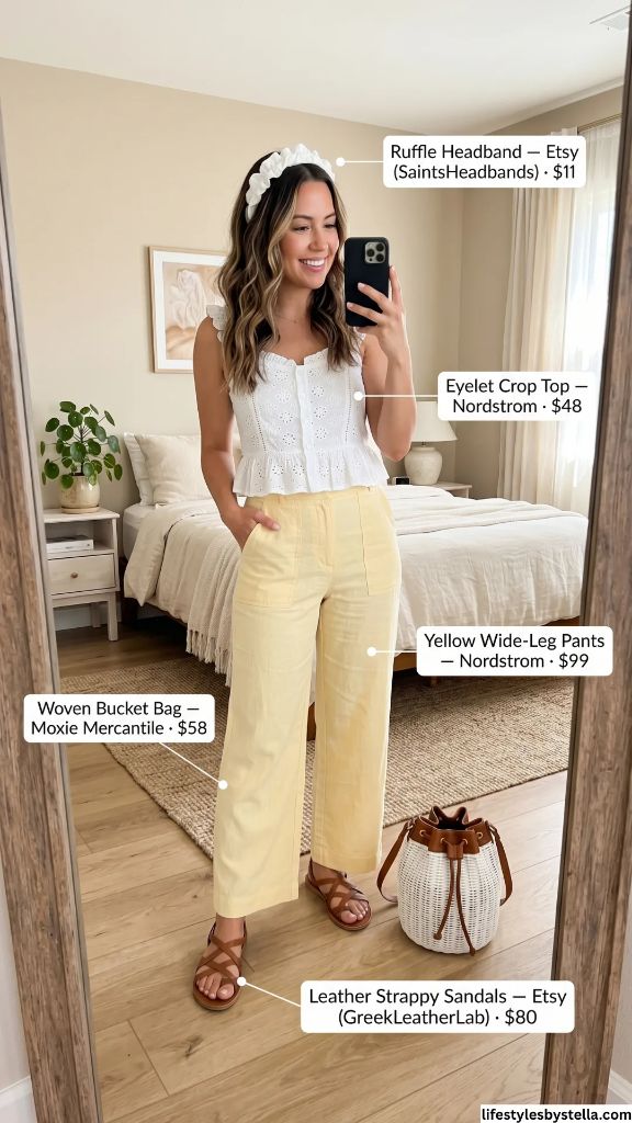 Shop This Look: The Ruffle Headband is from Etsy (SaintsHeadbands) at $11 — shop it here. The Eyelet Crop Top from Nordstrom at $48 — find it here. The Yellow Wide-Leg Pants from Nordstrom at $99 — grab them here. The Woven Bucket Bag from Moxie Mercantile at $58 — check it out here. And the Leather Strappy Sandals from Etsy (GreekLeatherLab) at $80 — shop them here.