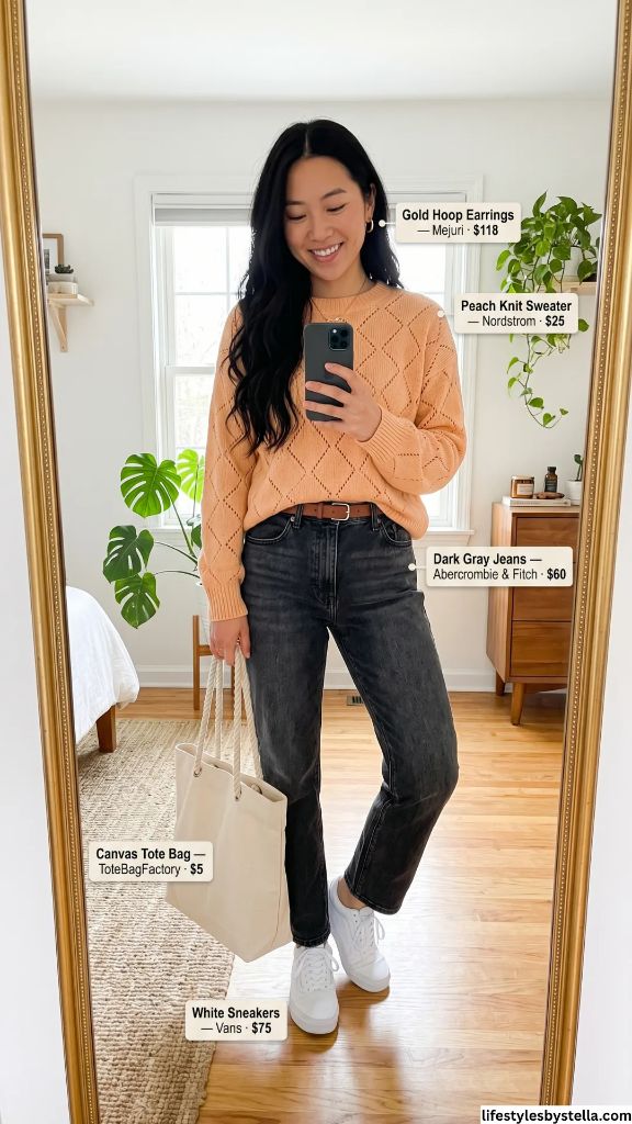 Shop This Look: The Gold Hoop Earrings are from Mejuri at $118 — shop them here. The Peach Knit Sweater from Nordstrom at $25 — find it here. The Dark Gray Jeans by Abercrombie & Fitch for $60 — grab them here. The Canvas Tote Bag from ToteBagFactory at $5 — check it out here. And the White Sneakers from Vans at $75 — shop them here.