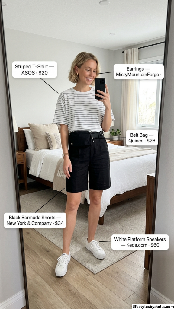 Shop This Look: The Striped T-Shirt from ASOS at $20 — shop it here. The Black Bermuda Shorts from New York & Company at $34 — grab them here. The Belt Bag from Quince at $26 — find it here. The Earrings from MistyMountainForge — check them out here. And the White Platform Sneakers from Keds at $60 — snag them here.