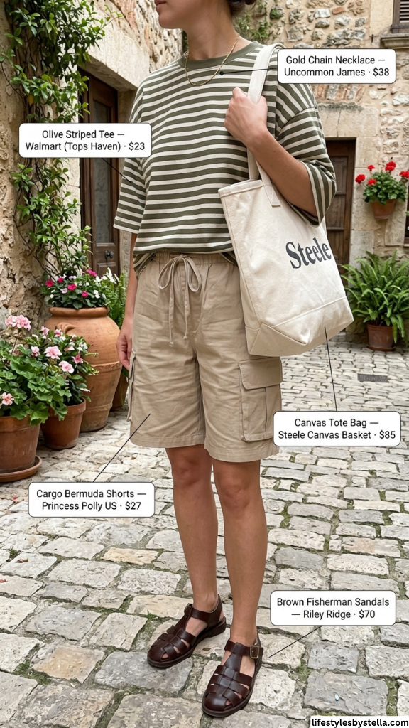 Shop This Look: The Olive Striped Tee from Walmart (Tops Haven) at $23 — shop it here. The Cargo Bermuda Shorts from Princess Polly US at $27 — grab them here. The Gold Chain Necklace from Uncommon James at $38 — find it here. The Canvas Tote Bag from Steele Canvas Basket at $85 — check it out here. And the Brown Fisherman Sandals from Riley Ridge at $70 — snag them here.