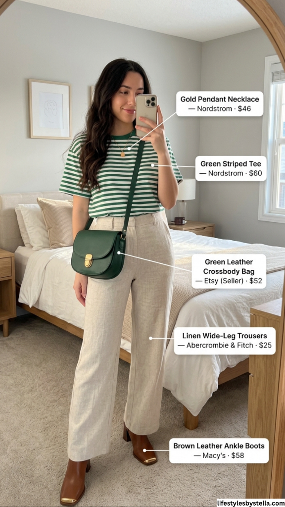 Shop This Look: The Green Striped Tee is from Nordstrom at $60 — shop it here. The Linen Wide-Leg Trousers from Abercrombie & Fitch at $25 — grab them here. The Green Leather Crossbody Bag from Etsy at $52 — find it here. The Gold Pendant Necklace from Nordstrom at $46 — check it out here. And the Brown Leather Ankle Boots from Macy’s at $58 — snag them here.