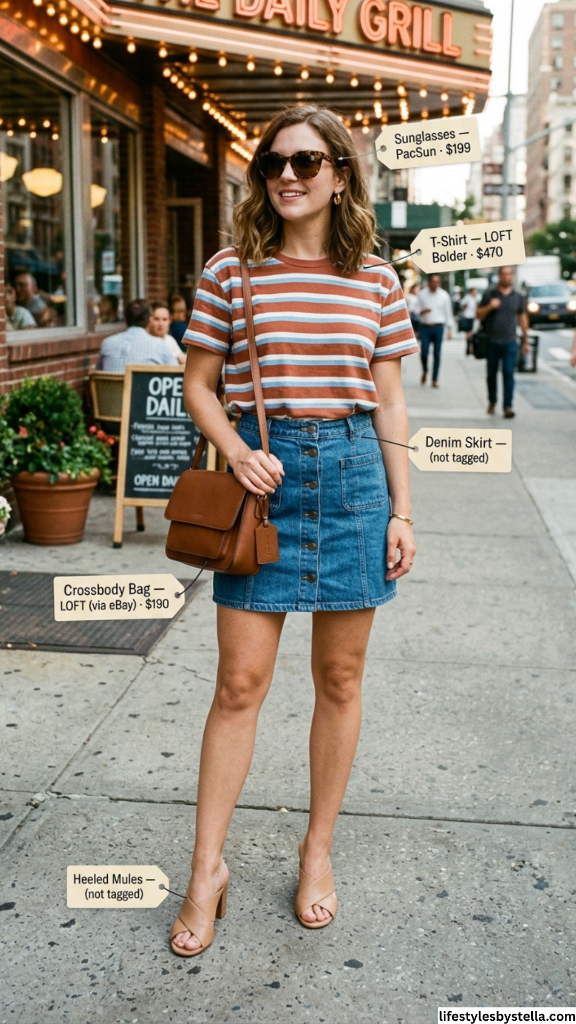 Shop This Look: The T-Shirt from LOFT Bolder at $470 — shop it here. The Sunglasses from PacSun at $199 — grab them here. The Crossbody Bag from LOFT via eBay at $190 — find it here. The Denim Skirt and Heeled Mules are not tagged with specific brand details in this look, but similar button-front denim skirts can be found at ASOS and nude mules at Nordstrom.