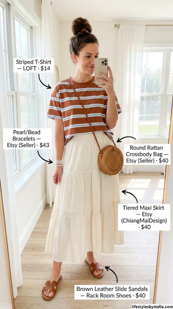 Shop This Look: The Striped T-Shirt is from LOFT at $14 — shop it here. The Tiered Maxi Skirt is from Etsy seller ChiangMaiDesign at $40 — find it here. The Round Rattan Crossbody Bag from Etsy at $40 — grab it here. The Pearl/Bead Bracelets from Etsy at $43 — check them out here. And the Brown Leather Slide Sandals from Rack Room Shoes at $40 — snag them here.