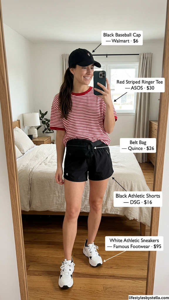 Shop This Look: The Red Striped Ringer Tee is from ASOS at $30 — shop it here. The Black Athletic Shorts by DSG for $16 — grab them here. The Black Baseball Cap from Walmart at $6 — find it here. The Belt Bag from Quince at $26 — snag it here. And the White Athletic Sneakers from Famous Footwear at $95 — check them out here.