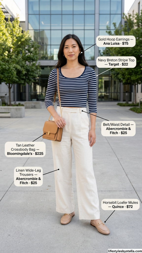 Shop This Look: The Navy Breton Stripe Top is from Target at $22 — shop it here. The Linen Wide-Leg Trousers from Abercrombie & Fitch at $25 — grab them here. The Belt/Waist Detail is also from Abercrombie & Fitch at $25 — find it here. The Gold Hoop Earrings from Ana Luisa at $75 — check them out here. The Tan Leather Crossbody Bag from Bloomingdale’s at $225 — shop it here. And the Horsebit Loafer Mules from Quince at $72 — snag them here.
