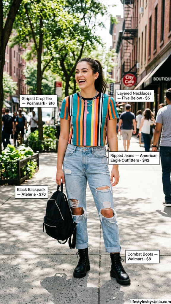Shop This Look: The Striped Crop Tee from Poshmark at $16 — shop it here. The Layered Necklaces from Five Below at $5 — grab them here. The Ripped Jeans from American Eagle Outfitters at $42 — find them here. The Black Backpack from Atelerie at $70 — check it out here. And the Combat Boots from Walmart at $8 — snag them here.
