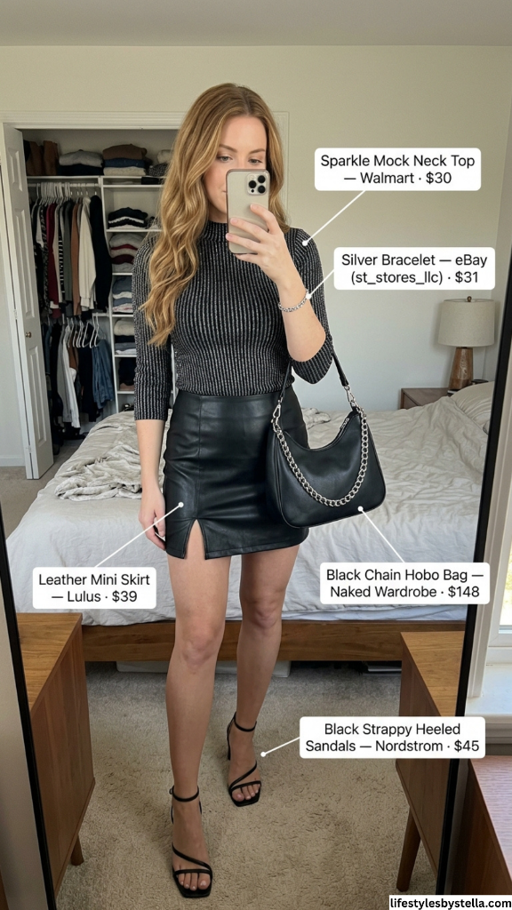 Shop This Look: The Sparkle Mock Neck Top is from Walmart at $30 — shop it here. The Leather Mini Skirt by Lulus for $39 — grab it here. The Black Chain Hobo Bag from Naked Wardrobe at $148 — find it here. The Silver Bracelet from eBay seller st_stores_llc at $31 — check it out here. And the Black Strappy Heeled Sandals from Nordstrom at $45 — snag them here.