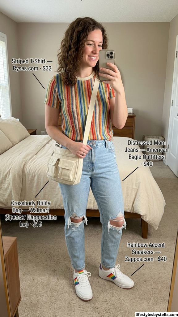 Shop This Look: The Striped T-Shirt from Ryses.com at $32 — shop it here. The Distressed Mom Jeans from American Eagle Outfitters at $49 — grab them here. The Crossbody Utility Bag from Walmart (Spencer Happucation Inc) at $15 — find it here. And the Rainbow Accent Sneakers from Zappos at $40 — snag them here.