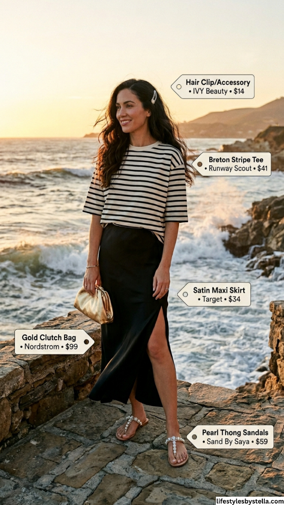 Shop This Look: The Breton Stripe Tee from Runway Scout at $41 — shop it here. The Satin Maxi Skirt from Target at $34 — grab it here. The Hair Clip/Accessory from IVY Beauty at $14 — find it here. The Gold Clutch Bag from Nordstrom at $99 — check it out here. And the Pearl Thong Sandals from Sand By Saya at $59 — snag them here.