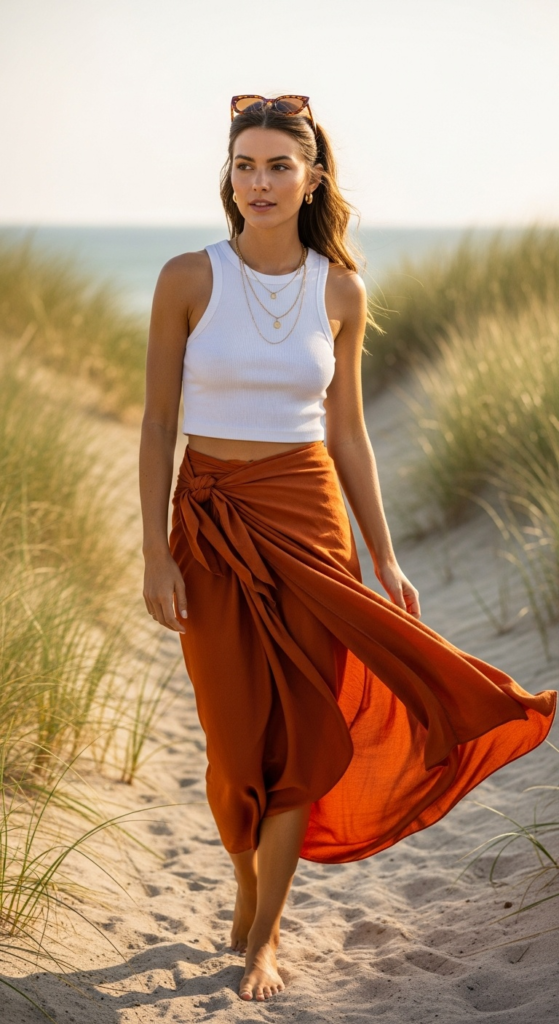 Suggested alt text: Stylish swimsuit cover ups idea with rust sarong worn as a low-slung maxi skirt and white tank on a sandy beach path
