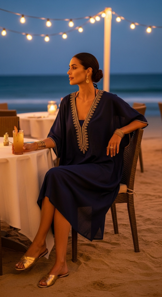 Suggested alt text: Stylish swimsuit cover ups look with a navy blue embroidered caftan at a candlelit beachside restaurant