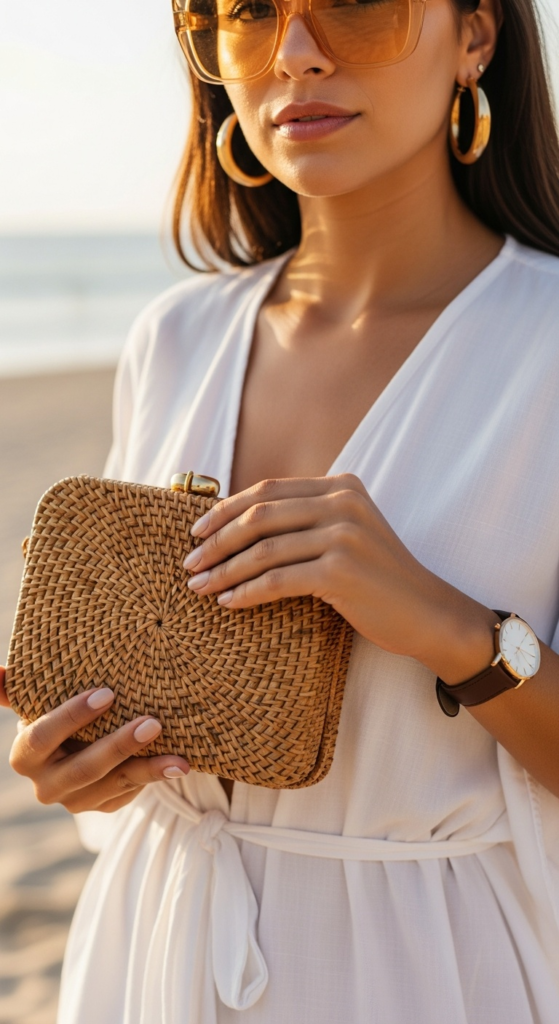 Suggested alt text: Stylish swimsuit cover ups accessory detail with woven clutch, gold huggie hoops, amber sunglasses, and a white cover-up
