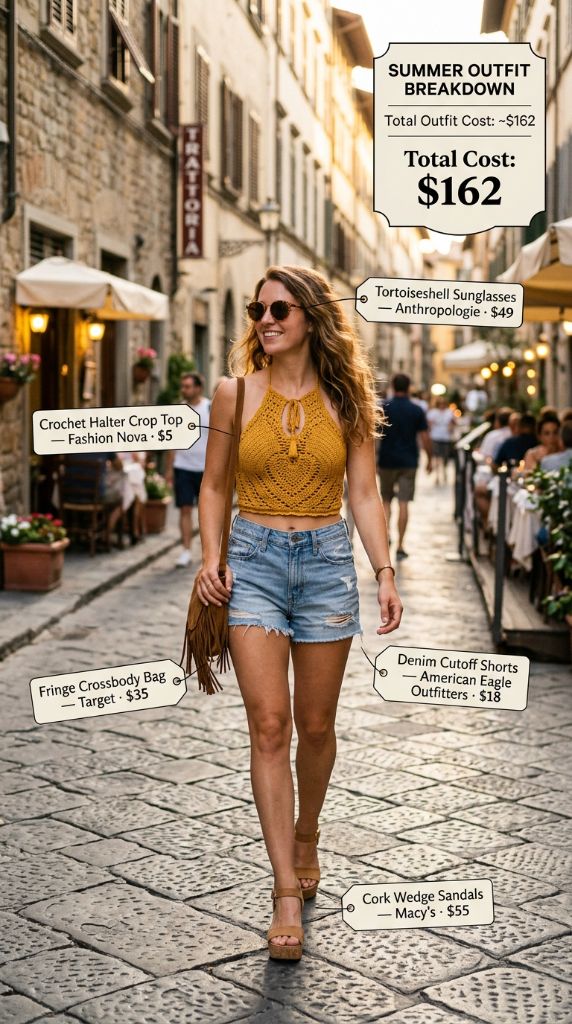 This outfit has main-character-walking-through-an-Italian-village energy, and I am fully here for it. The mustard-gold crochet halter crop top from Fashion Nova — at just $5, by the way — has that intricate, hand-crocheted look with a tie-front detail that adds a little flirtiness without going overboard. The warm golden tone practically glows against sun-kissed skin, and when you pair it with classic denim cutoff shorts from American Eagle ($18), you’ve got a summer uniform that feels both effortless and totally on-trend.