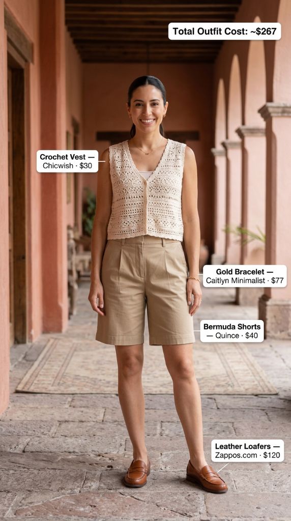 At ~$267, this is a smart investment in pieces that work beyond just crochet outfits. The loafers transition into fall. The Bermuda shorts work with blazers. And the vest can be layered over everything from slip dresses to button-downs. That’s the real test of a good outfit — can the pieces stand on their own? Every single one here can.