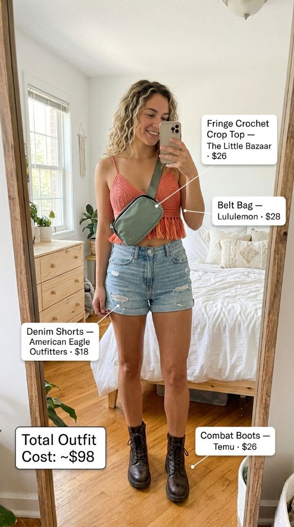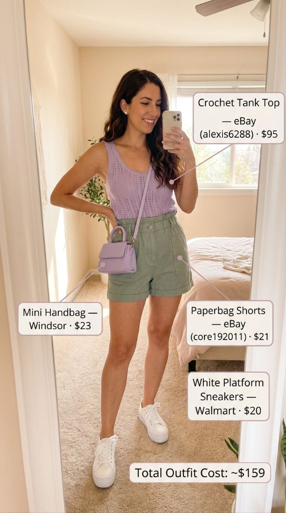 And at roughly $159 total? That’s a full head-to-toe look for less than most people spend on a single pair of shoes. The crochet tank from eBay is definitely the statement piece here, but the real MVP might be those $20 Walmart sneakers. Never underestimate a good budget find.