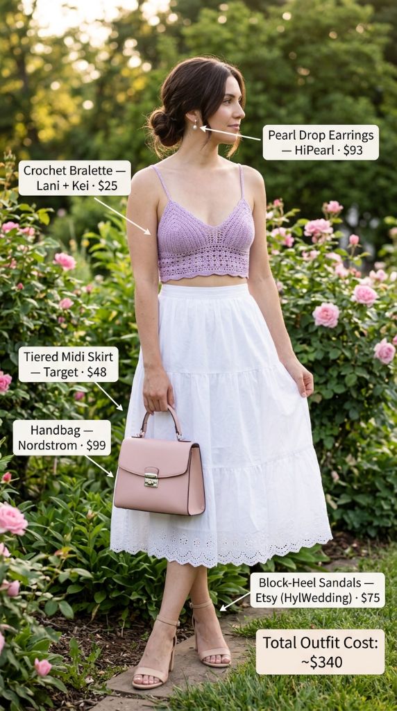 This outfit is a love letter to soft femininity. The lavender crochet bralette from Lani + Kei ($25) has delicate spaghetti straps and that slightly cropped, fitted shape that pairs perfectly with high-waisted bottoms. The color is that perfect dusty purple — not too bright, not too muted — and against the crisp white of a tiered eyelet midi skirt from Target ($48), it creates a look that feels like it belongs in a rose garden. Which, honestly, is exactly where this photo appears to be. And I’m not mad about it.