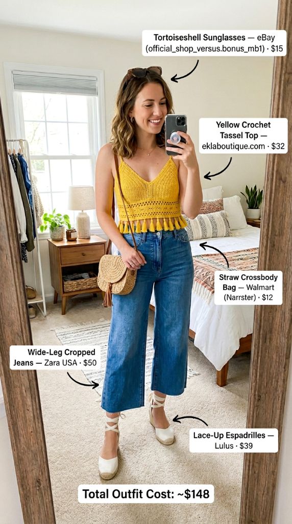 The straw crossbody from Walmart ($12) is the budget hero of this outfit — natural woven texture, the perfect size for phone-keys-lip balm, and it ties into the organic, handmade aesthetic of the crochet top. Tortoiseshell sunglasses from eBay ($15) complete the look. At ~$148, this is one of those summer crochet top outfits women can throw together without overthinking it.