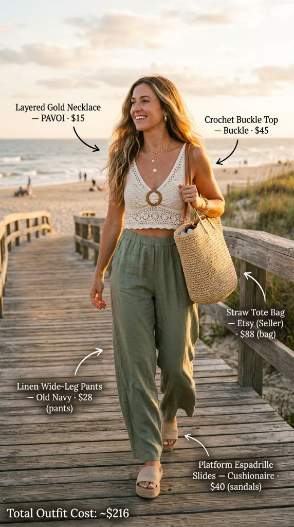 The sage green linen wide-leg pants from Old Navy ($28) are doing God’s work here. They’re flowy, they’re breathable, they drape beautifully in a sea breeze, and they cost less than a cocktail at most beach bars. The combination of white crochet and green linen is inherently vacation-ready — it’s the kind of color palette you see in travel magazines and think, “I want to be that person.” Well, for $216 total, you can be. The platform espadrille slides from Cushionaire ($40) add just enough height to make the wide-leg hem fall perfectly, and the straw tote from Etsy ($88) is roomy enough for a beach towel, a book, and your sunscreen.