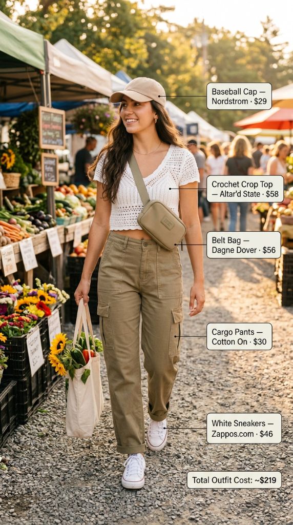 11. White Crochet Crop Top Outfit with Cargo Pants for a Farmer’s Market Day