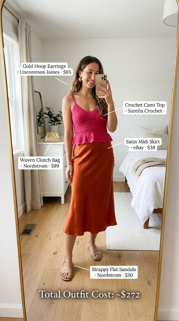 This outfit stopped me mid-scroll the first time I saw it. The color combination of hot pink crochet against that rich, burnt-orange satin? It shouldn’t work on paper, but in practice it’s absolutely stunning. The crochet cami has this gorgeous peplum detail with a scalloped hem that gives it a romantic, artisan feel — and when you pair that handmade texture against the liquid smoothness of a satin midi skirt, you get this beautiful contrast of rough and refined. It’s warm-toned perfection for summer 2026.