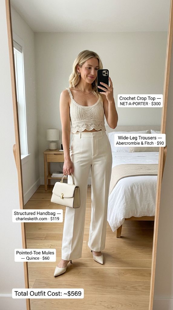 If minimalism had a summer uniform, this would be it. This cream-on-cream crochet crop top outfit is the kind of look that makes you feel expensive without the price tag to match — well, mostly. The NET-A-PORTER crochet top ($300) is definitely a splurge, but the scalloped hem and delicate stitch pattern give it a quality you can see from across the room. Paired with those ivory wide-leg trousers from Abercrombie, the entire silhouette is clean, elongated, and effortlessly chic.