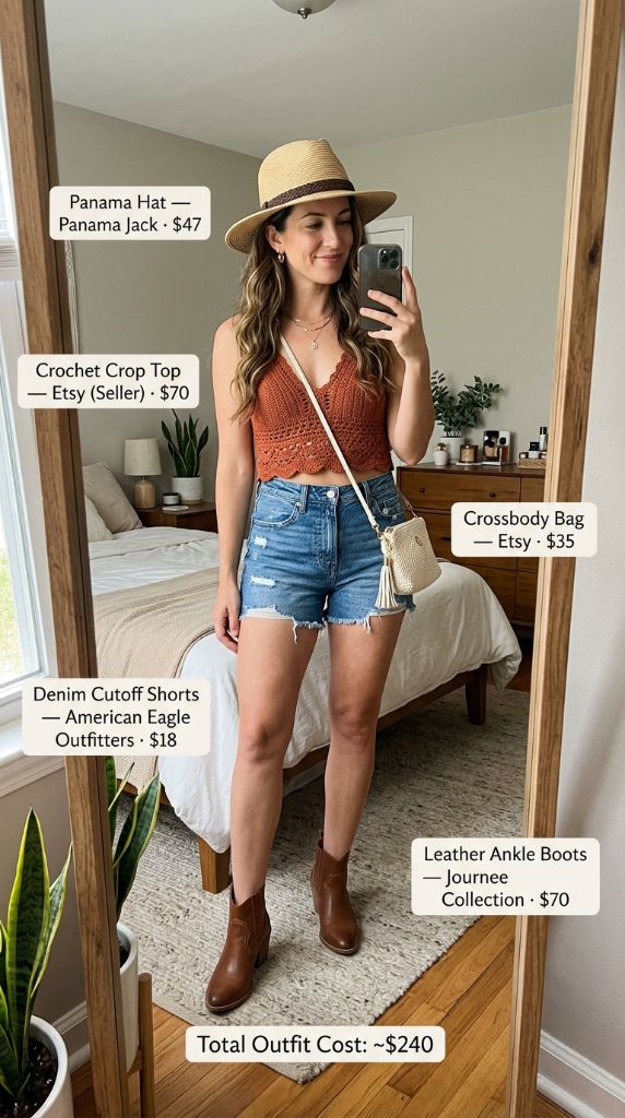 If boho crochet crop top styling ideas had a mood board, this outfit would be pinned right in the center. The rust-colored crochet crop top from Etsy ($70) has a deep V-neckline and that gorgeous scalloped hem that screams handmade love. The warm terracotta tone is one of those universally flattering shades that looks incredible against every skin tone, and when you layer on a Panama hat from Panama Jack ($47), you’ve got instant vacation energy regardless of your zip code.