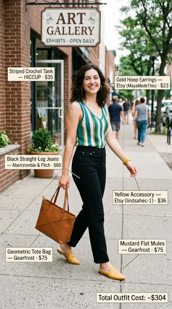 The mustard flat mules from Gearfrost ($75) are the unexpected detail that elevates everything. Instead of reaching for the obvious black sandal or white sneaker, that pop of warm yellow ties back to the golden undertones in the crochet pattern beautifully. The geometric tote bag (also Gearfrost, $75) has that structured, architectural shape that’s been trending hard this year, and the gold hoop earrings from Etsy ($23) are the kind of everyday accessory I literally never take off. If you’re someone who loves summer outfits for women over 40 that feel youthful without trying too hard, this one’s for you.