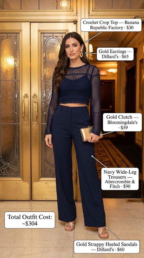 This is the kind of summer crochet crop top outfit you’d wear to a summer going-out situation — a birthday dinner, a cocktail bar, a summer wedding reception. The gold accents — earrings, clutch, sandals — are the only color break you need, and they add warmth that prevents the navy from feeling too corporate. The Banana Republic Factory top at $30 is proof that elevated style doesn’t require a designer budget.