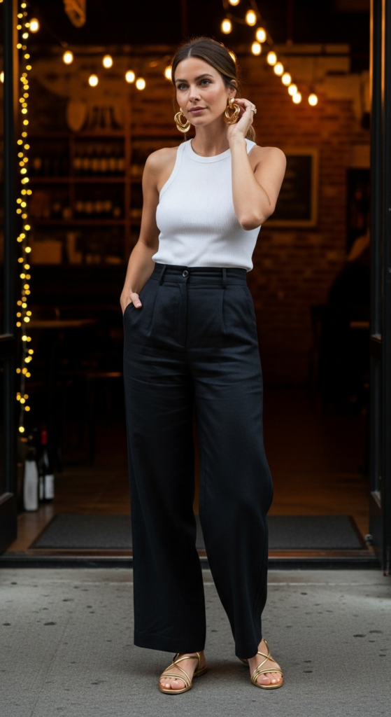 Suggested alt text: summer going out outfits idea with black wide-leg linen pants, white ribbed tank, gold sandals, and gold hoop earrings outside a wine bar