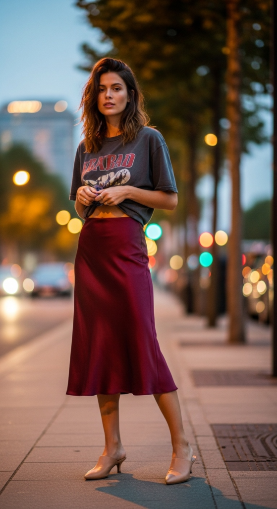 Suggested alt text: summer going out outfits look with burgundy satin midi skirt, gray vintage band tee, and nude kitten heel mules at dusk