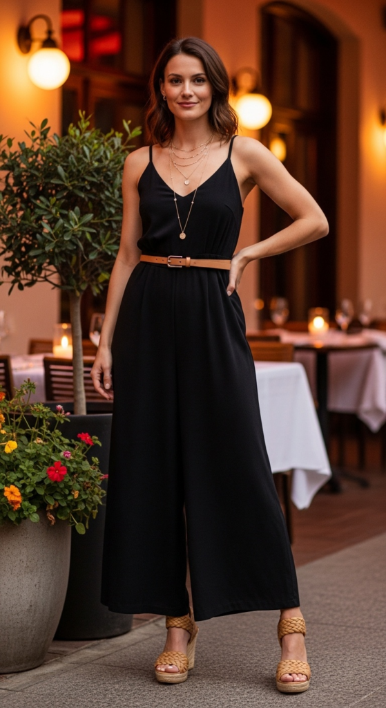 Suggested alt text: summer going out outfits idea featuring a black wide-leg jumpsuit with tan belt and wedge sandals on a restaurant patio