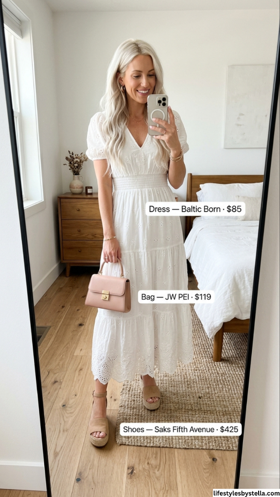 What I love most about this summer maxi dress is its versatility. Wear it to a garden party, a bridal shower, a Sunday brunch, or even just running errands when you want to feel put together without trying too hard. The all-white palette makes accessorizing a breeze — you can go warm with nude and blush tones like you see here, or add pops of color with turquoise jewelry or a bright red lip. If you’re someone who gravitates toward comfortable summer outfits, this dress delivers that in spades while still looking incredibly polished.