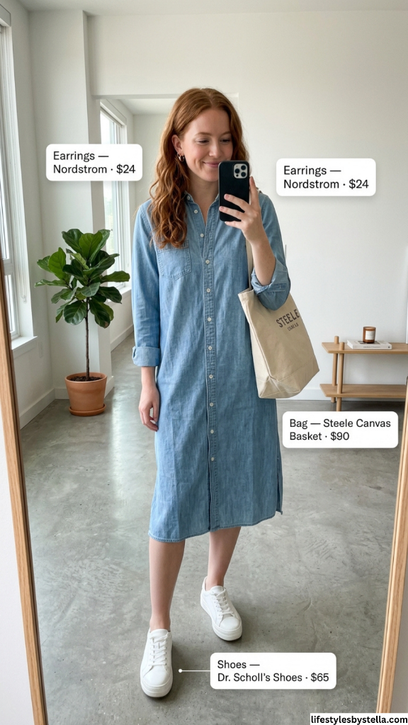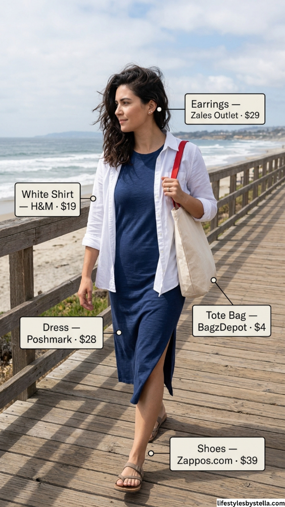 The total cost of this outfit is remarkably budget-friendly too — the dress was found on Poshmark for $28, the shirt is just $19 from H&M, and the canvas tote from BagzDepot is a steal at $4. Pearl stud earrings from Zales Outlet ($29) round out the look with a touch of classic elegance. Proof that stylish maxi dresses and summer fashion don’t require a big budget.