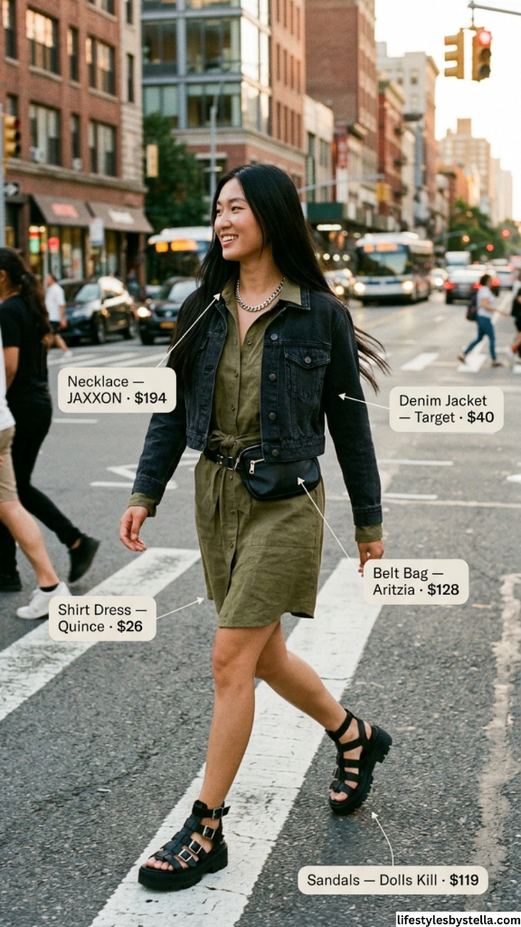 Shop This Look: The Shirt Dress is from Quince at $26 — shop it here. The Denim Jacket from Target for $40 — grab it here. The Necklace by JAXXON at $194 — find it here. The Belt Bag from Aritzia for $128 — shop it here. And the Sandals from Dolls Kill at $119 — find them here.