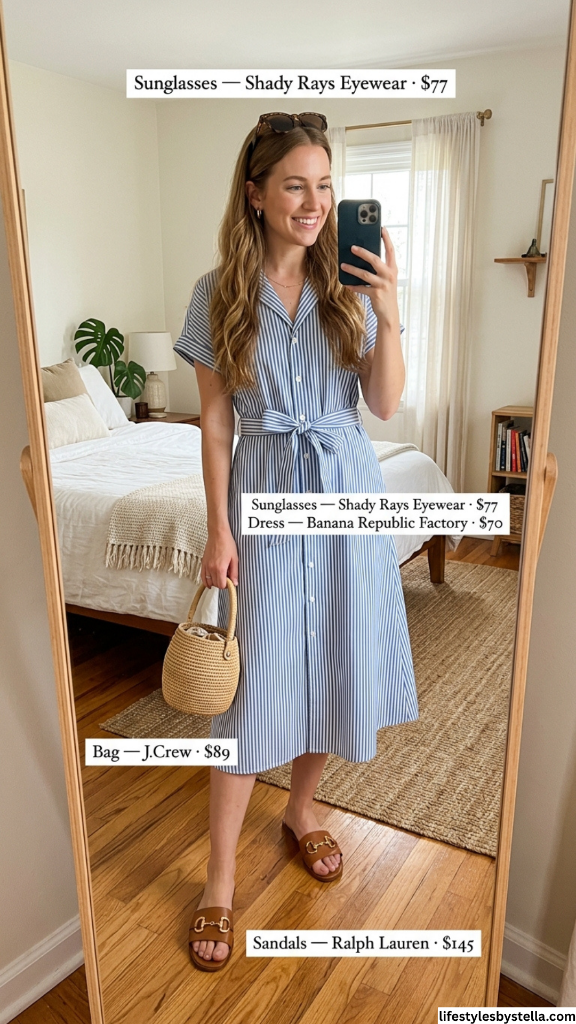 Shop This Look: The Sunglasses are from Shady Rays Eyewear at $77 — shop them here. The Dress from Banana Republic Factory for $70 — grab it here. The Bag by J.Crew at $89 — find it here. And the Sandals from Ralph Lauren at $145 — shop them here.