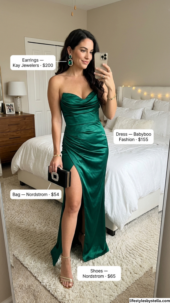 What sets this summer maxi dress apart from your average going-out dress is how elevated it feels without breaking the bank at $155. The emerald green color is universally flattering — it looks stunning against every skin tone and pairs beautifully with both warm and cool metallics. The styling here is impeccable: nude strappy heels from Nordstrom keep the focus on the dress, the black crystal-embellished clutch adds a touch of glamour, and those statement emerald earrings from Kay Jewelers tie the whole look together. If you’re looking for summer going out outfits ideas 2026, this is the showstopper.