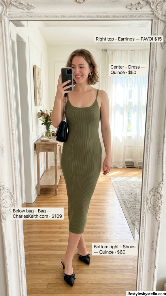 I love when a dress does that thing where it looks incredibly simple on the hanger but absolutely transforms when you put it on — and this olive ribbed knit dress from Quince is exactly that. The fine-gauge ribbed fabric clings gently to the body without being restrictive, the spaghetti straps are delicate and feminine, and the midi-to-maxi length hits at that perfect sweet spot. The olive green color feels earthy and sophisticated, a gorgeous alternative to black that still gives you that sleek, put-together energy.