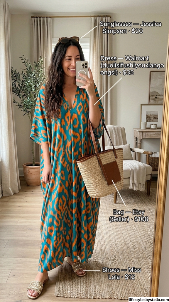 This summer maxi dress is all about ease and self-expression. The loose silhouette is incredibly forgiving and flattering on every body type — it skims rather than clings, which makes it one of those rare pieces that genuinely looks good on everyone. The teal-and-orange color combination is bold and joyful, the kind of palette that makes people smile when you walk into a room. If you’re planning Miami vacation outfits or any tropical getaway, this dress belongs in your suitcase. It also works beautifully for plus size summer outfit ideas 2026 because of its generous, flowing cut.