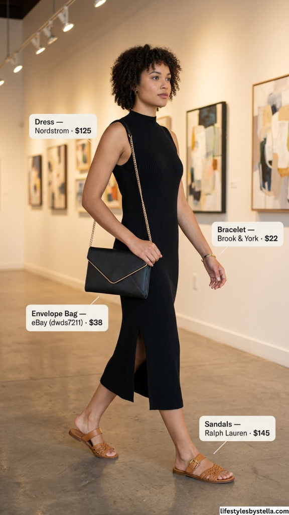 This is one of those stylish maxi dresses that works in contexts where most maxi dresses don’t. An art gallery opening? Perfect. A client dinner? Absolutely. A rooftop cocktail hour? Without question. The black fabric absorbs light in a way that creates this beautiful, clean silhouette, and the simplicity of the design means your accessories can really shine. Here, the styling goes warm and organic — tan woven Ralph Lauren sandals, a gold bracelet from Brook & York, and a black envelope crossbody bag from eBay that adds a polished finishing touch.
