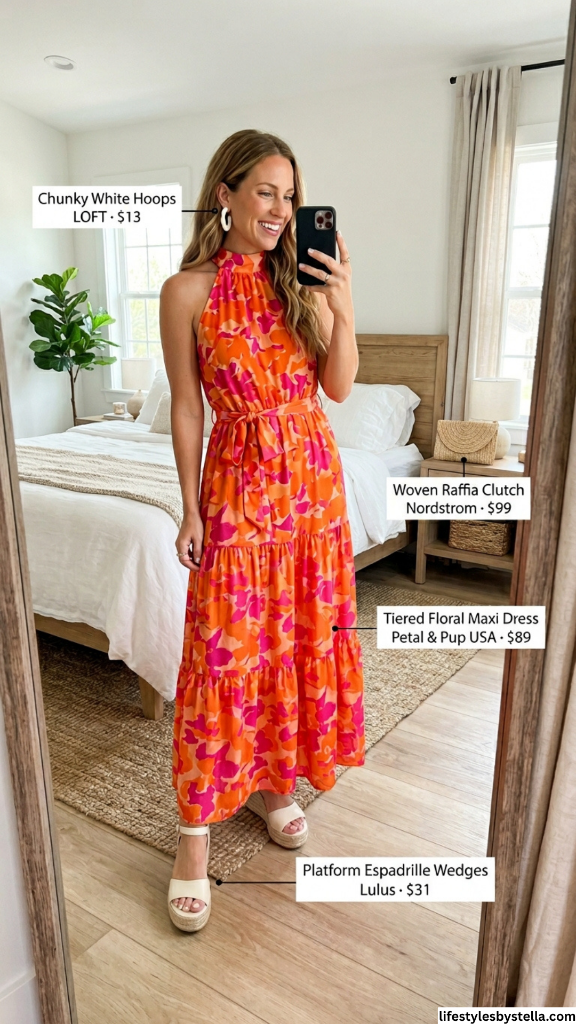The accessories play the supporting role perfectly — chunky white hoop earrings from LOFT at just $13 echo the playful vibe, a woven raffia clutch from Nordstrom adds texture, and those cream platform espadrille wedges from Lulus give you height while keeping you comfortable. If you’re looking for maxi dress outfit ideas that make you feel alive, this is the one.