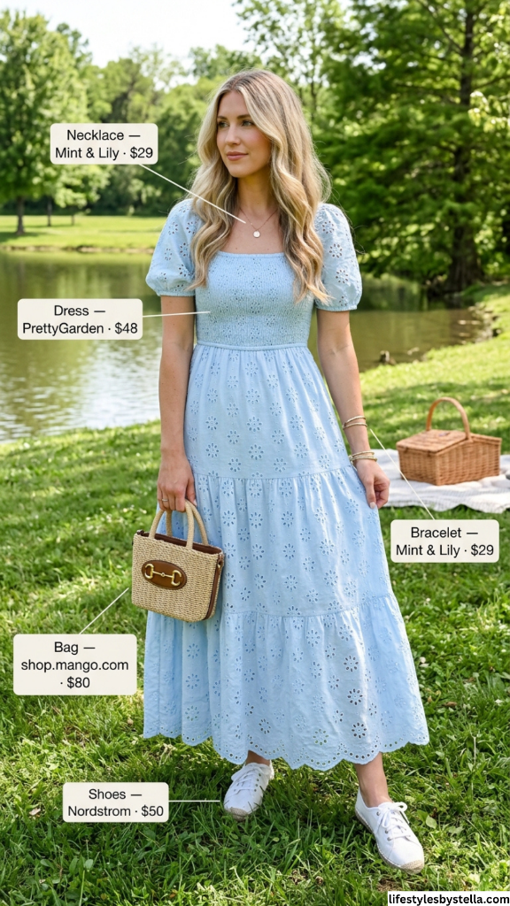 What makes this maxi dress outfit really sing is the setting and the styling. Paired with crisp white sneakers from Nordstrom, it has that “I’m going to a picnic in the park and I look adorable” energy that’s impossible to fake. The woven mini bag from Mango adds a structured, fashion-forward element that elevates the whole look, and the dainty necklace and bracelet from Mint & Lily tie everything together with delicate gold accents. This is the kind of outfit that works for cute summer skirt outfits 2026 lovers who want to try the maxi dress version of that same sweet, put-together aesthetic.