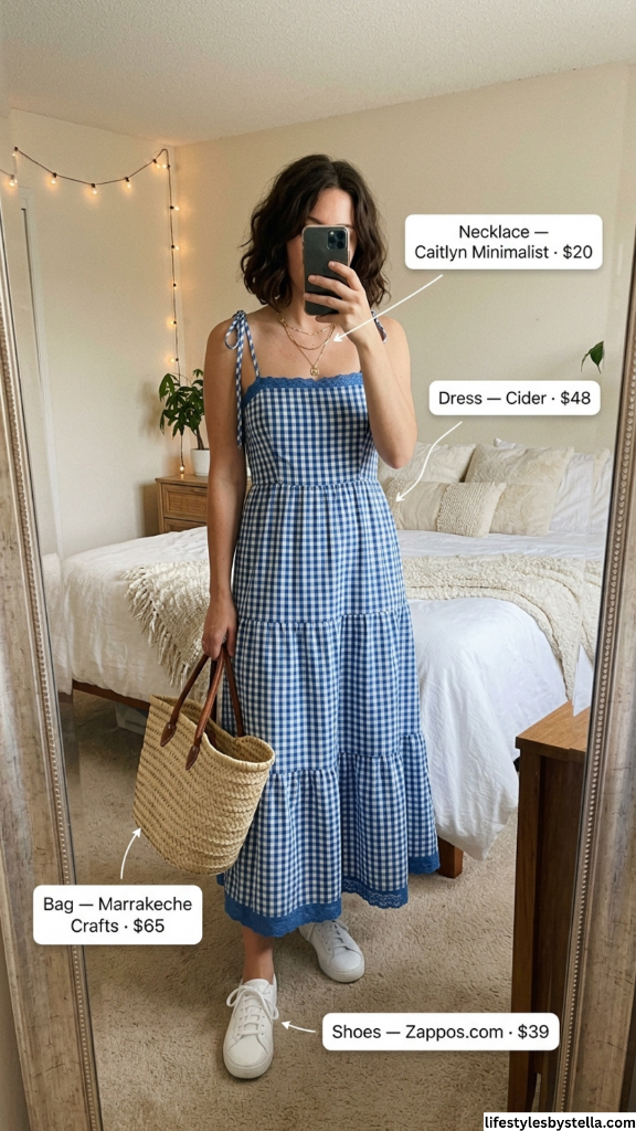 I always tell people that the right accessories can make or break a maxi dress outfit, and this look proves it beautifully. The combination of woven textures, dainty gold jewelry, and casual white sneakers creates a cohesive story — relaxed, feminine, and effortlessly put-together. If you’ve been exploring maxi skirt for summer styling tips, a lot of the same principles apply to maxi dresses — it’s all about balancing volume with structure.
