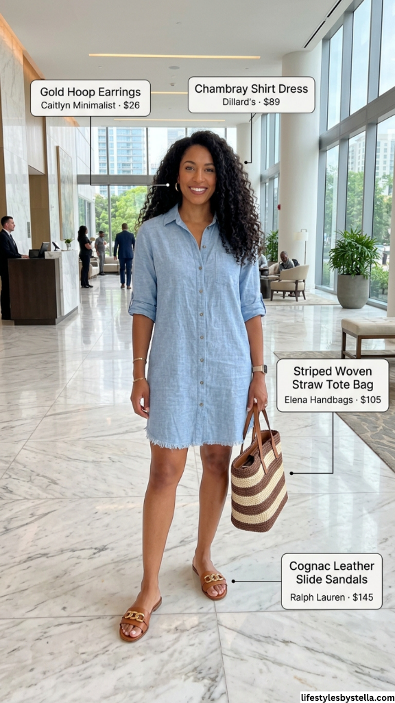 Shop This Look: The Chambray Shirt Dress is from Dillard’s at $89 — shop it here. The Gold Hoop Earrings from Caitlyn Minimalist at $26 — grab them here. The Striped Woven Straw Tote Bag from Elena Handbags at $105 — find it here. And the Cognac Leather Slide Sandals from Ralph Lauren at $145 — shop them here.