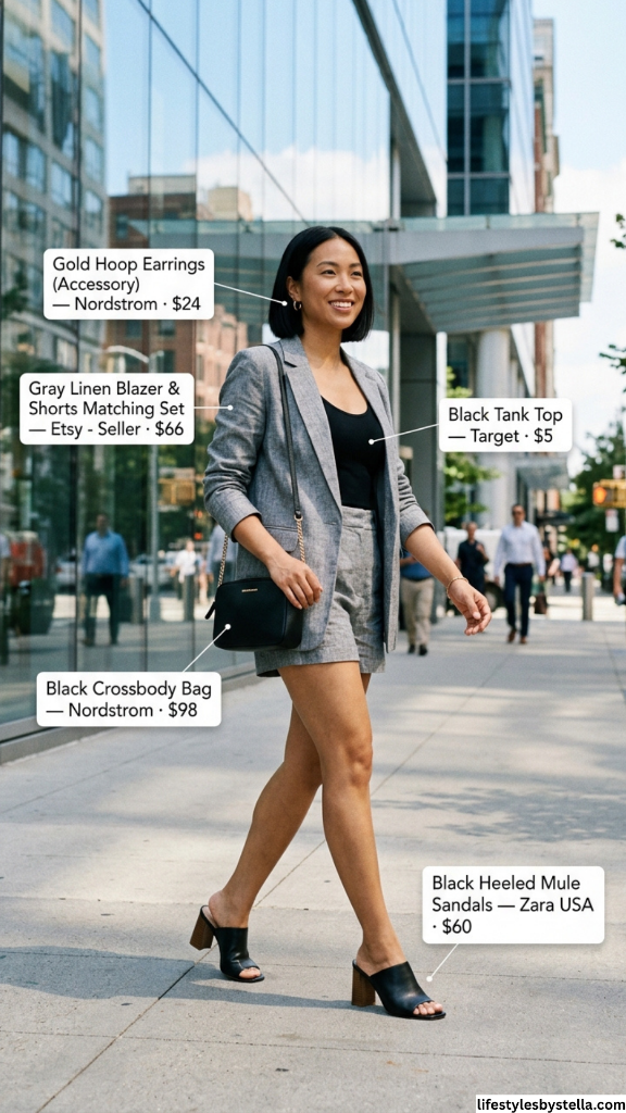 Shop This Look: The Gray Linen Blazer & Shorts Matching Set is from an Etsy seller at $66 — shop it here. The Black Tank Top from Target at $5 — grab it here. The Gold Hoop Earrings from Nordstrom at $24 — find them here. The Black Crossbody Bag from Nordstrom at $98 — shop it here. And the Black Heeled Mule Sandals from Zara USA at $60 — find them here.