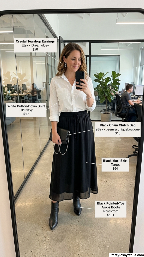 Shop This Look: The White Button-Down Shirt is from Old Navy at $17 — shop it here. The Crystal Teardrop Earrings are from Etsy seller IDreamofJev at $28 — grab them here. The Black Chain Clutch Bag from eBay seller beemissuniqueboutique at $13 — find it here. The Black Maxi Skirt from Target at $54 — shop it here. And the Black Pointed-Toe Ankle Boots from Nordstrom at $101 — find them here.